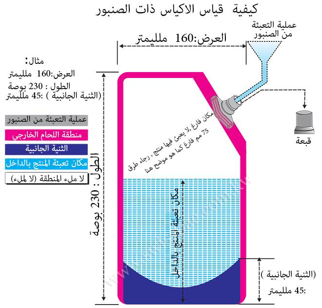 و يوجد نوعين من الاكياس ذات الصنبور تبقا لحجم الصنبور يمكنك الختيار بينهم 10 مم او 22 مم و ايضا يمكنك اختيار مكان اضافة الصنبور سواء فى الجانب بزاوية 45% و تم ملىء الكيس من فتحة فى اعلى الكيس او يمكن اضاقة الصنبور فى منتصف الجزء العلوى من الكيس و يمكن ملىء الكيس من الصنبور.